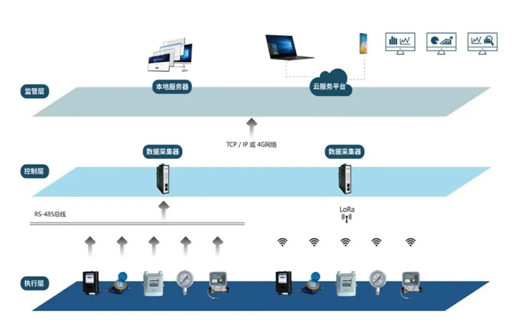 通過 RS-485 總線或 LoRa 通訊模塊,將計量表具的數(shù)據(jù)收集到智能網(wǎng)關(guān),在施工布線困難的情況下,采用 LoRa 無線通訊模塊,免去復雜的施工布線,將計量表具的數(shù)據(jù)簡單有效地傳輸?shù)街悄芫W(wǎng)關(guān)。